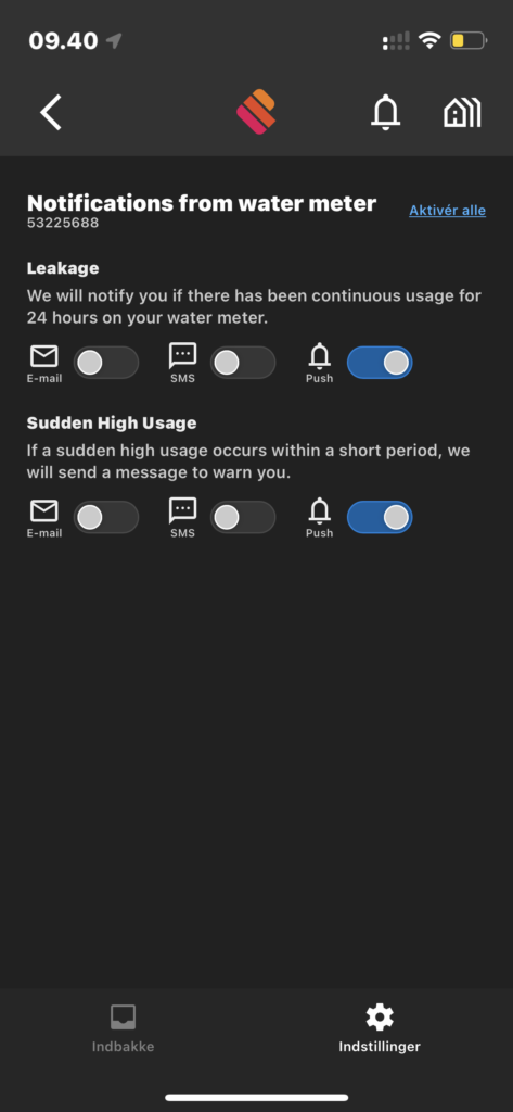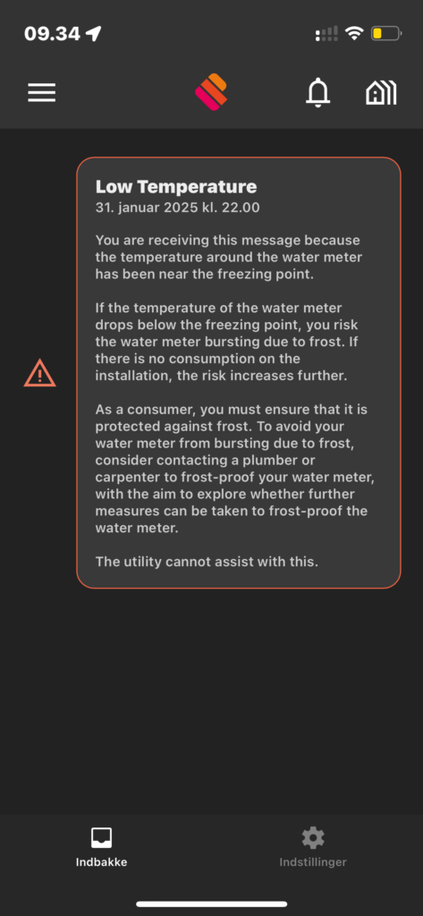 Det vigtigste tilbage nu at fortælle om, er den lille ringeklokke, der kan du læse alarmer (pludseligt højt forbrug, lækage alarm eller lav temperatur)