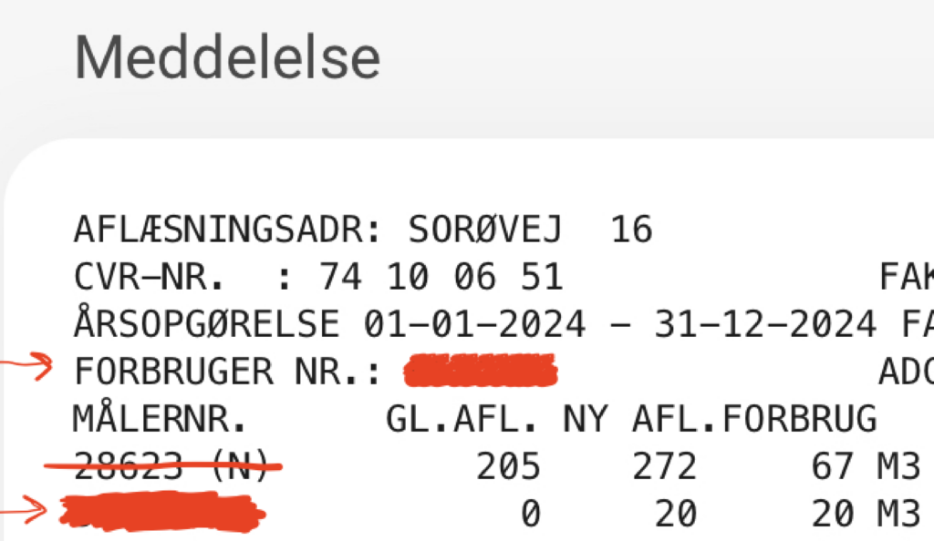 Som du måske bemærker, så er dette lettere anonymiseret, du bør heller ikke dele disse oplysninger med andre, målernummer begynder med 53, forbrugernummer begynder med 9.